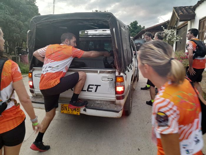 Mais première difficulté, il faut s’y rendre au fond du canyon! Soit avec les bus de l’organisation (mais départ de San Gil à 4h du matin) soit par nos propres moyens, à savoir un pick-up local, pris à 5h30 du matin! Levé, remplissage des camel-bags et diverses artifices propres à chacun!