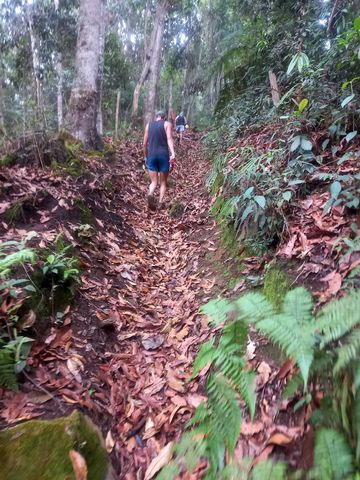 C’est après que le cauchemar commence…. on va alterner rudes montées et rudes descentes! Avec des péripéties: mauvaise signalisation, tous les meneurs se trompent (je crois), certains faisant plus de 2km de trop, moi aussi mais je ne ferais que 800m en voyant revenir tout le groupe! Très déstabilisant car c’est comme si tout reprenait à 0 après 7 km de course! Tu te retrouves devant des coureurs dont tu ne devrais même pas apercevoir les chaussures, et derrière d’autres qui étaient déjà derrière toi! Ajoutons également un sentier très étroit dans les fougères pour atteindre le point haut du parcours, où nous nous croisons difficilement.