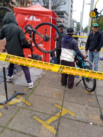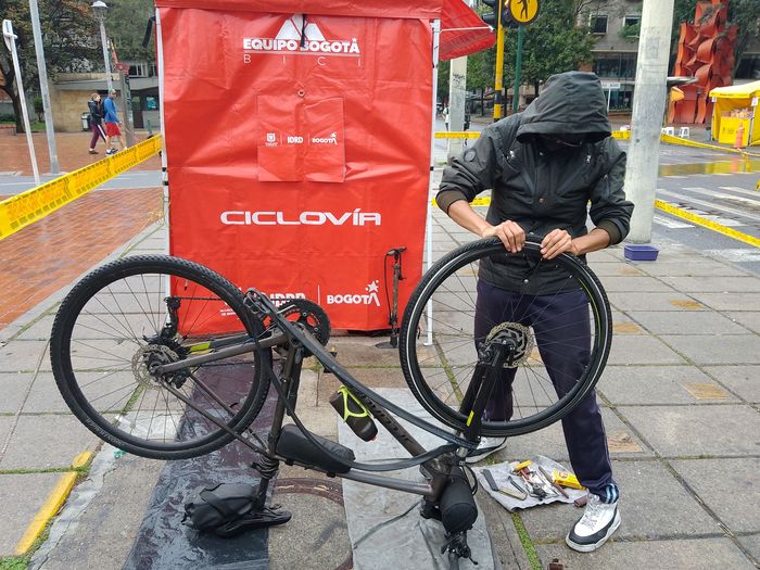 Qui commence à pied donc! Je tente un passage sur la 11, où il y a normalement un gros psot de réparateurs… vénézuéliens (pour les livreurs Rappi à vélo). Mais nous sommes dimanche (bien que les livreurs bossent quand même). Alors je bifurque vers le Parque Virrey, où je trouve un stand de réparation « officiel ».