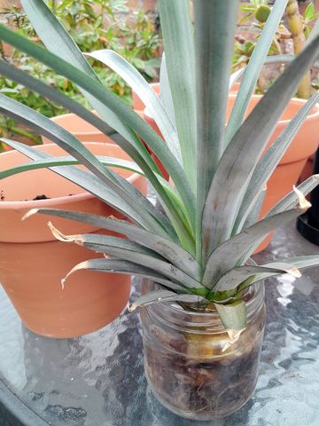 - un plant d’ananas. Tu sais celui qui racine dans son bocal, tel un poisson rouge, depuis des années. Mais qui a vraiment poussé! Là c’est un pari… car pas sûr qu’il soit heureux en terre, ce plant!