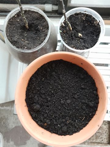 Puis, après avoir acheté quelques pots bon marché mais surtout récupéré de la belle terre noire bien riche lors de ma visite à la finca de Jean…. additionnée à mon fin compost récolté avec amours ces derniers mois.