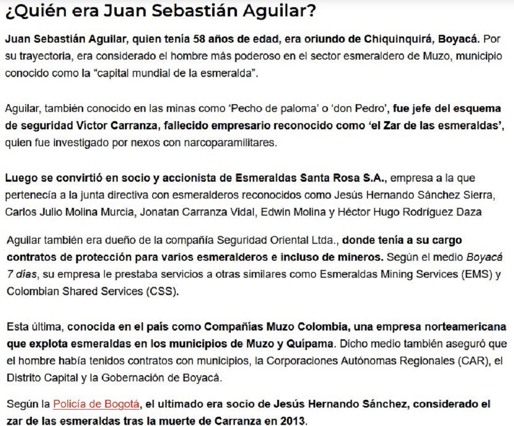 Considéré comme l’homme le plus influent de Muzo, il fut en son temps chef du service de sécurité du fameux Victor Carranza; mais aussi actionnaire d’importantes sociétés d’extraction d’émeraudes mais aussi de sécurisations d’entreprises minières, souvent américaines; enfin, on le soupçonne d’appartenir à l’entourage de Jésus Hernando Sanchez, le successeur du Tsar des émeraudes originel!