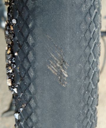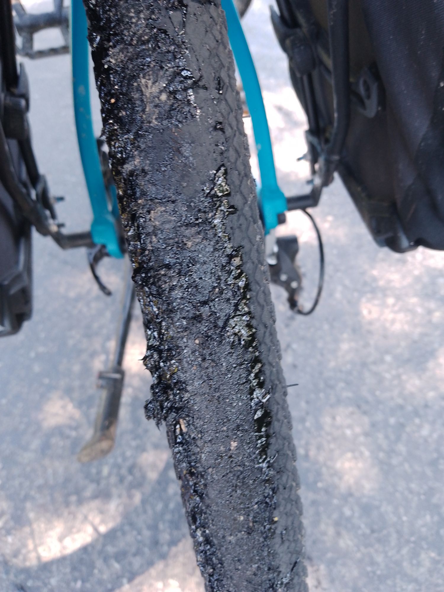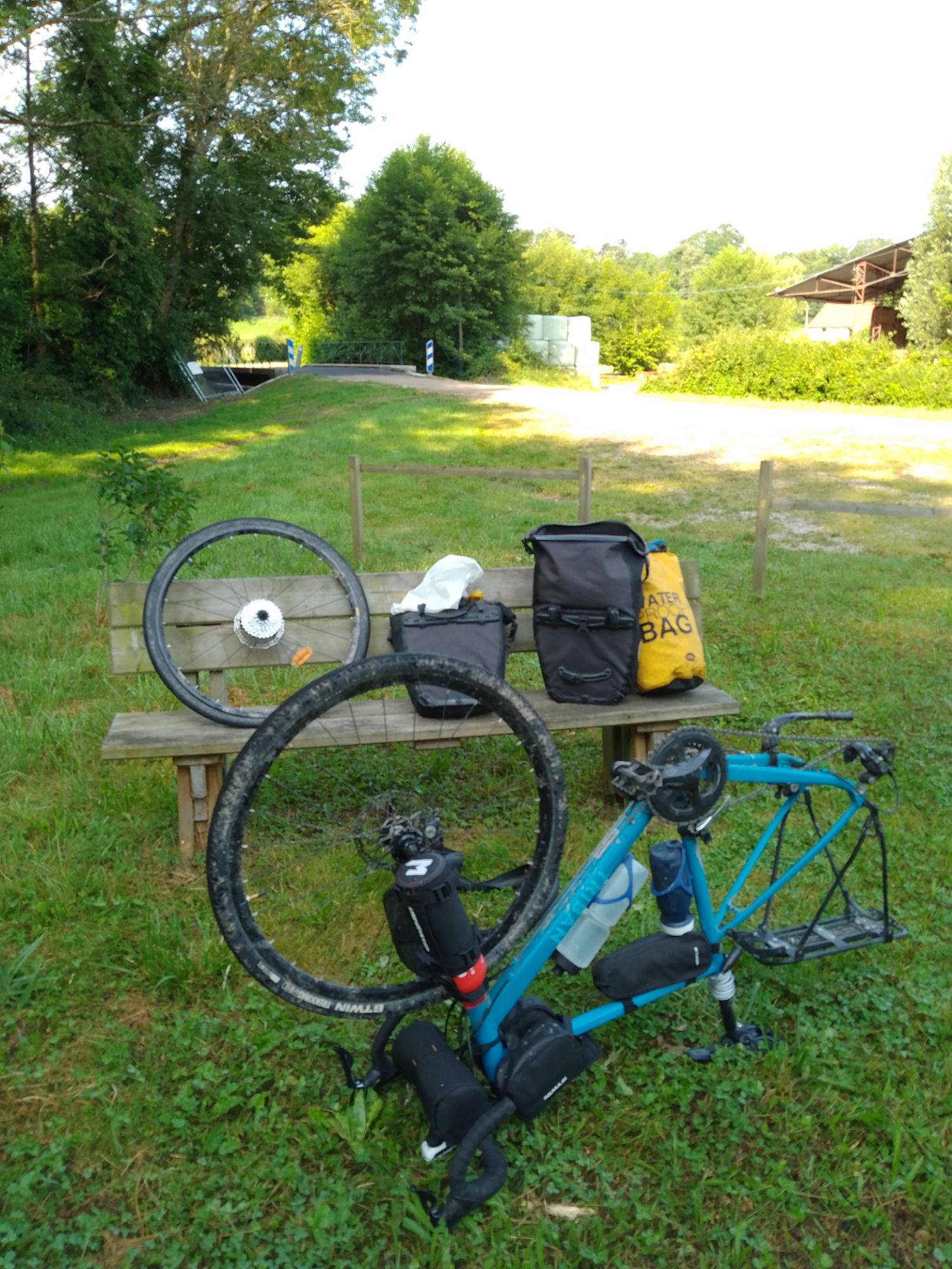 Une année un peu galère de ce côté-là. Premièrement, je suis parti avec un pneu arrière un peu usé! Non Yann, il était encore tout à fait en état! Sauf qu’avec 20 kilos de poids sur la gueule, et une crevaison lente (je regonflais tous les matins), son cas ne s’est pas arrangé et il a fini, c’est le terme exacte, usé jusqu’à la trame. Ajoutons à cela l’erreur de débutant, le passage dans une « flaque » de goudron fondu (ceux qui ont déjà arpenté les petites routes de campagne me comprennent) qui a entraîné pas mal de déboires!