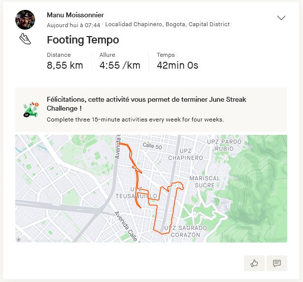 Le 26 juin, 3 jours après la course une sortie tempo car j’étais en forme! Et j’en ai profité pour enfin faire un double des clés du nouvel appart!