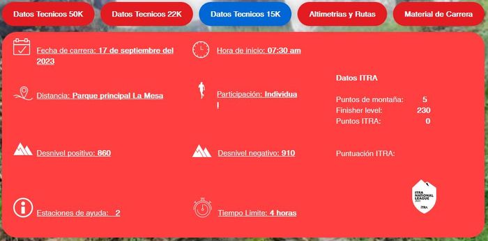 Mais bon l’intéressant de ce genre de post (si il y a quelque chose à en tirer) ce sont les données de la course! Que j’ai trouvé sur le site de Copa Tequendama évidemment. Première angoisse, point de « 11K »…. 15,22,ou 50!!!