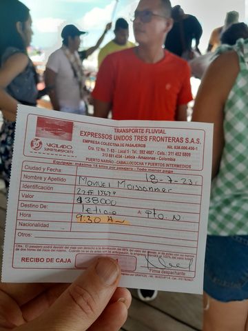 Puerto Nariño ne s’atteint que en lancha en remontant le fleuve Amazone. Ce le mardi, avec la lancha de 10h (la première part à 7h00 et la 3e et dernière à 13h30). Mais avant cela il fallait acheter nos billets (les places partent vite) et nous le fîmes le lundi après-midi. Enfin après avoir compris où et comment: 3 compagnies assurent la liaison mais elles n’opèrent qu’un seul jour. Ce jour-là, le mardi, c’était les « rouges qui sortaient. Les bleues et les vertes ne travailleront que le lendemain pour l’une et le surlendemain pour l’autre, et ainsi de suite. Enfin sauf la première lancha revenant de Puerto Nariño le lendemain à 7h est opérée par la « couleur » de la veille (forcément elle y est arrivée à 15h30 et ne repart surtout pas à vide).