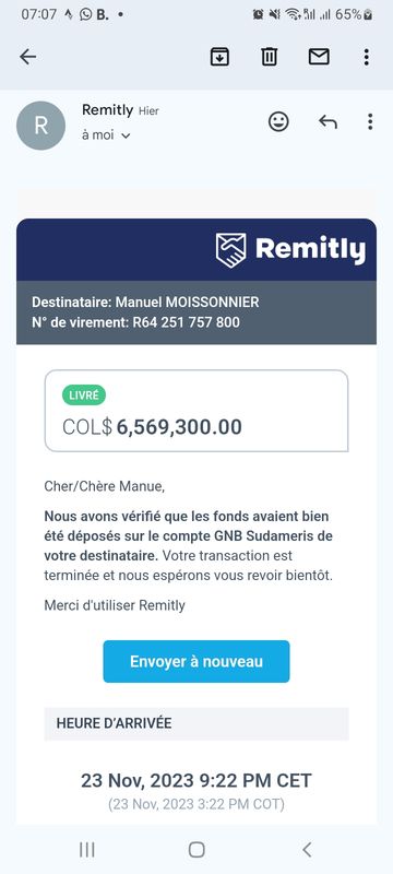Et là c’est devenu plus compliqué: Azimo semblait gèrer tout le transfert seul, alors que Remitly a un intermédiaire, Pay W, en Colombie. Et je soupconne que ce soit ce dernier qui rend ces transferts moins simples et fluides, alors que j’en ai de plus en plus besoin, puisque je paye maintenant mon loyer en pesos, via un virement depuis mon compte colombien vers un autre compte colombien.