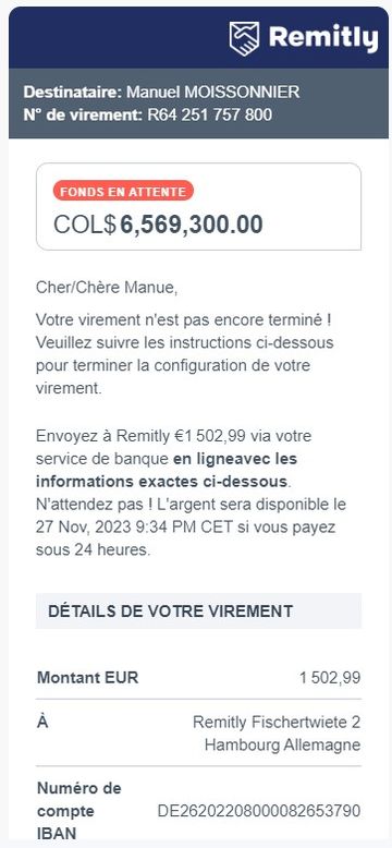 Mais le 4e, initié fin novembre a été une catastrophe. Au début, tout marcha comme sur des roulettes…. Transfert demandé sur l’app Remitly, argent viré depuis mon compte francais, sur le compte allemand de cette start-up, puis le dossier pour l’intermédiaire, et moins de 48h plus tard, la confirmation de la réussite du virement, sur l’app et par SMS de la part de Pay W.