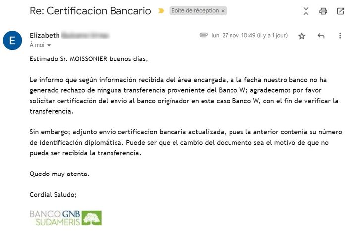 Visiblement GNB Sudameris a refusé de crèditer mon compte (je te rappelle que je m’envoie de l’argent à moi-même…). Sauf qu’en interrogeant ma banque locale, ils m’assurent n’avoir refuser aucun virement.