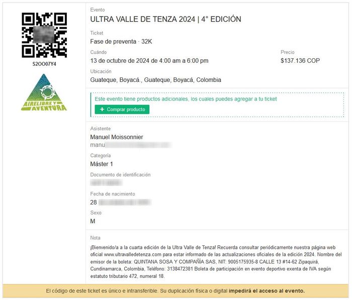 Inscription faite en ligne tout début septembre, juste avant que le tarif n’augmente (138.000 pesos – 35€)…