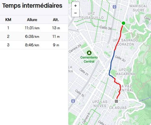 Descente, puis plat sur la Septima que je tiens à un bon rythme: 4:15/km jusqu’au 5e et l’entrée du Parque Nacional, donc quasiment au début de la réelle (et très courte au final) partie trail. Je monte plutôt bien, plus habitué au D+ que la plupart des participants) et surtout en pensant à Yann, qui me disait dans la tête, « sur 11K tu ne marches pas »! Plat sur la Cirumvalar et descente, très courte elle aussi pour sa portion « sentier ».