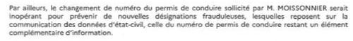 Ici, on indique donc le refus de m’octroyer un nouveau numéro de permis pour ne pas me conférer une immunité sur la route! Argument général que je comprends, mais il serait bon de se rappeler ma situation: je vis 10 mois et demi par an hors du territoire français et ne possède pas de véhicule en France. Donc mon impunité serait toute relative.