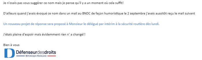 Et donc enfin, un troisième paragraphe, où l’on m’indique que je dois simplement continuer à contester les infractions qui me sont imputées, dont je n’ai généralement connaissance que quand on me saisit sur mes comptes, et dont Mme la Déléguée semble ignorer que chaque infraction doit se réaliser en 3 courriers recommandés (le premier à l’OMP de Rennes, le suivant pour demander la restitution des points et le 3e parfois pour demander le remboursement des sommes injustement prélevées) et qu’un recommandé coûte plus de 7 euros.