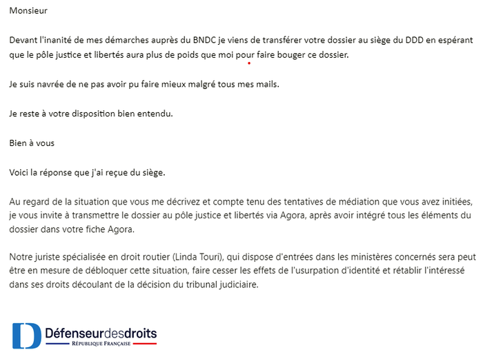 Tu le sais, tous mes espoirs d’un règlement de la situation étaient basés sur un changement de numéro de permis de conduire, qui pourrait alors empêcher la déclaration par un tiers de mon état de conducteur lors d’infraction commis par eux, puisque le numéro utilisé (celui qui traîne sur Internet) ne serait plus valide. Or ce changement, qui m’avait annoncé comme possible, était lié à l’obtention d’une décision de justice en ma faveur, reconnaissant mon statut de victime d’usurpation! Processus très long, puisqu’il fallait déposé plainte, patienter le temps de l’enquête, obtenir les documents liés à cela. Enfin, en juillet 2021, j’obtenais ce précieux document que je faisais parvenir, via le Défenseur de Droits, au Bureau National des Droits à Conduire, seul apte à ordonner un changement de numéro de permis.