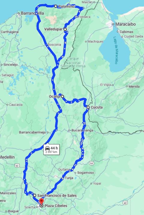 Sauf qu’en mettant en place le calendrier des étapes, le timing semble tendu: une arrivée à Palomino au mieux le mardi, et l’obligation d’être à Cucuta au minimum le jeudi soir (la traversée de la frontière et le trajet jusqu’à San Cristobal prend au moins une demi-journée et ce, dans chaque sens). Et nos vacances sont étranges, nous reprenons le jeudi 31! Or il faut aussi 2 jours pour redescendre.