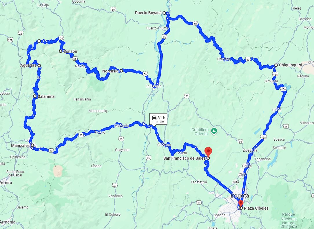 Il restait l’option « aventure »! Mais bizarrement, c’est au moment de tracer la route, que j’ai le moins d’idée! Quand il y a un but (la Côte, Cucuta,…) c’est globalement plus simple! Partons sur le même principe! Quelques centaines de kilomètres au côté de Ferny (donc départ le dimanche apm, il a des obligations) et passage pour une bise à Vincent. Et, celui-ci recevant de la famille venue de France, nuit à la ville suivante, Villeta, que je ne connais pas (nous passons souvent à l’extérieur).