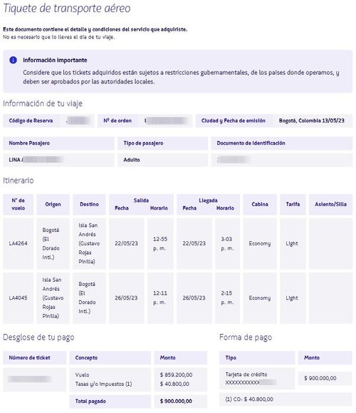 Puis je suis allé sur Latam Colombia (où là je pouvais bien acheter 2 billets, mais n’avais pas accès à mon Latam Wallet pour payer…), et j’ai acheté un billet, celui de Lina. Pour 900.000 pesos, en essayant de ne pas me tromper dans le choix des vols (entre 6 à 8 par jour pour cette destination)!