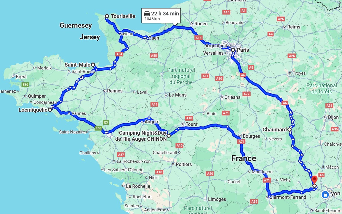 Ce qui demandait un brouillon avec quelques étapes et le repérage des possibilités d’arrêt. Soit en aire de camping-car, soit en camping. Avec des préférences pour les aires gratuites et les campings municipaux.