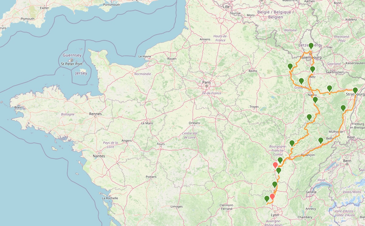 Puis en France, chaque été (sauf 2023), sur notre merveilleux réseau de véloroutes! L’Opération Manche-Méditerranée en 2019; La ViaRhôna et le tour du Léman en 2020 malgré la pandémie; le Luxembourg depuis Lyon en 2021, et les bords de Loire en 2022.