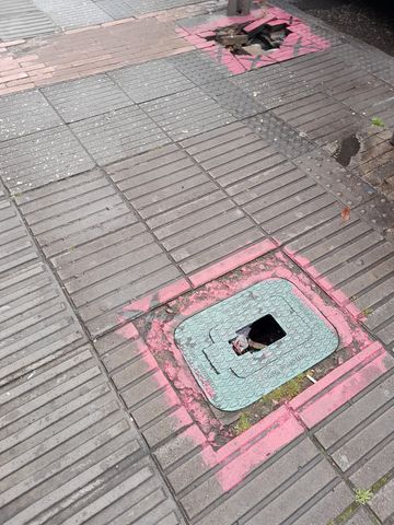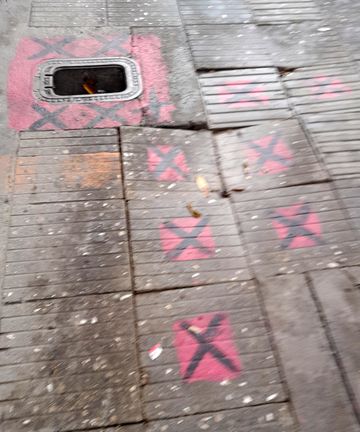 Et j’ai tenté d’en savoir plus…. Et j’ai trouvé plusieurs articles dont celui de Noticias RCN: en gros l’initiative à mi-chemin entre la blague et la dénonciation, vient d’un jeune bogotanais qui a réuni autour de lui d’autres bonnes volontés et qui peint des avertissements sur les dalles branlantes des trottoirs de Bogota (+ de 1000 alors que l’initiative a commencé fin avril)!