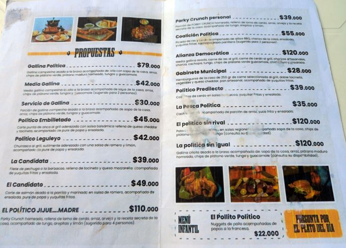 Mais de la viande sur une carte originale, avec des noms de plats liés à la vie politique!