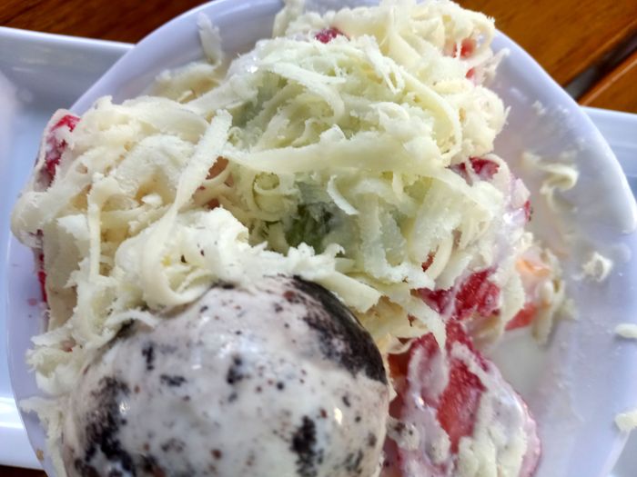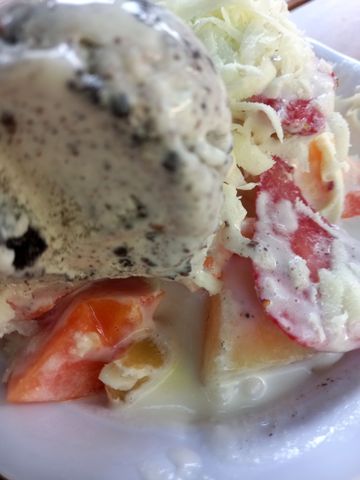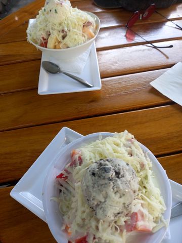 Et dehors, surtout du frais, le soda aux fruits…. ou la fameuse salade de fruits coloñbienne (avec glace et …. fromage rapé dessus).