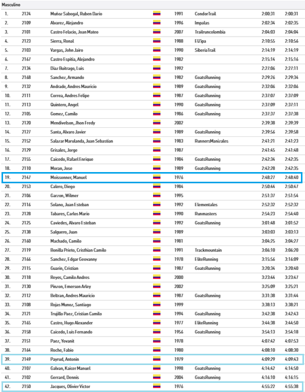 Pourquoi si bas dans le tableau, alors que généralement nous sortons tous un peu plus haut. D’abord tu le constates, peu de participants. 55 en tout. Et la plupart issus des gros clubs de coureurs de montagne de la région. Donc un peu une compétition interne (et financée par les extérieurs? Je reviendrais sur cette remarque un peu acerbe…). Donc des participants entraînés et motivés.