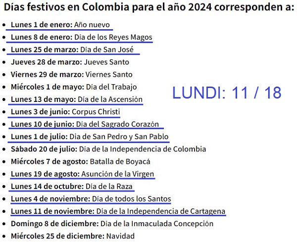 Tu remarqueras aussi, mais normalement tu le sais déjà…. pas mal de ces jours sont positionnés ici un lundi. Même si dans les faits ils ne tombent pas vraiment ce jour là! C’est, si j’ai compris, fait pour compenser le peu de vacances des salariés colombiens dans le droit du travail local.