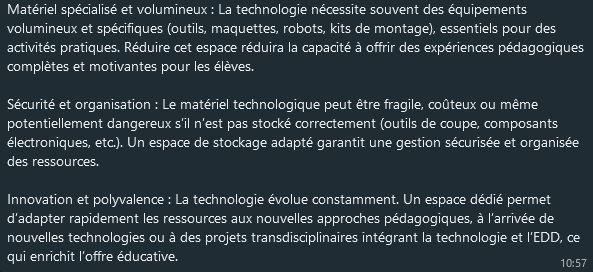 Appuyé de mes 2 collègues de Techno, Jean et Bruno, nous préférons montrer notre bonne volonté, en faisant un grand ménage et libérant un peu de place, afin qu’ils se sentent plus à l’aise et moins oppressés, mais nous refusons de stocker notre matériel volumineux et dangereux directement dans nos salles!