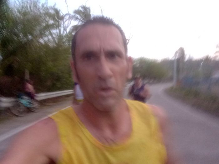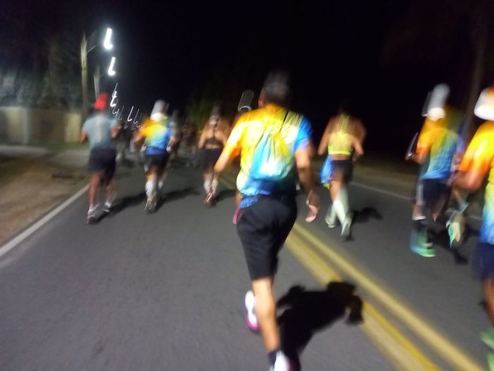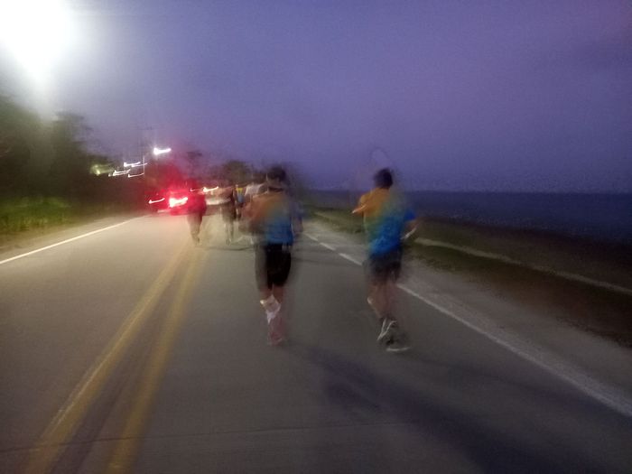 Je partais (nous, à part Antonin, habitué des marathons) donc plutôt dans l’inconnu et ce pour 3 principales: la spécificité d’une épreuve sur route, la distance (jamais fait plus de 26 km) mais également le climat! J’ai donc plutôt les conseils du cousin pistard et routard Mick (plutôt que ceux du traileur Guigui), en résumé, partir calmement en surtout ne se faisant pas piéger par l’euphorie ambiante gagnant pas mal de participant; voir à tenir un rythme convenable et faire un point u 15e kilomètre à mi-course! Et à partir de là, adapter sa fin de course. Sur la première partie, départ de nuit donc, passage devant notre hôtel au 11e kilomètre et arrivée à la pointe sud aux alentours du 17e.
