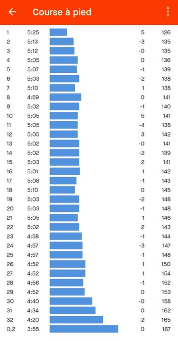 Délicat surtout pour un néophyte! Commençons par enfoncer des portes ouvertes: même si c’est courir, une course sur route (surtout avec 62m de D+ sur 32K) n’est pas du tout la même chose qu’un trail! Je préfère évidemment ce dernier, mais j’ai pris beaucoup de plaisir à m’essayer sur ce type d’épreuve! En gros, si j’ai compris, l’art est de maintenir une allure régulière, la plus rapide possible en gérant ses jambes, son souffle et sa nutrition. Et j’ai l’impression d’avoir globalement bien réussi: aucun, absolument aucun soucis de souffle (ni de point de côté), un rythme très régulier (voir graphique) et des jambes aux mollets fragiles mais que j’ai su contrôler pour éviter la crampe fatale (même si je l’ai sentie plusieurs fois s’approcher).