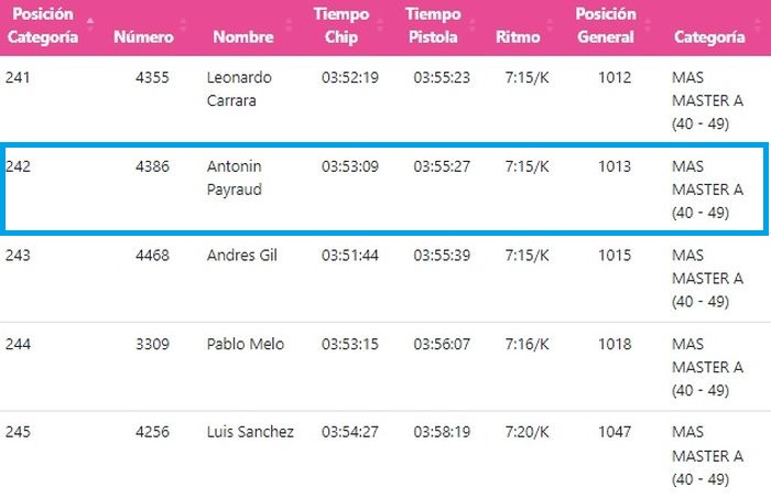 Je finis par un coup de chapeau: à mon ex-coéquipier de foot (de l’équipe de France de la Copa Naciones, pas la dernière des parents du lycée) « Pata », qui finit … second sur le 21K!! Avec un temps de 1h23′ et une allure de 3’59 au km, belle perf l’ami! Et belle reconversion!